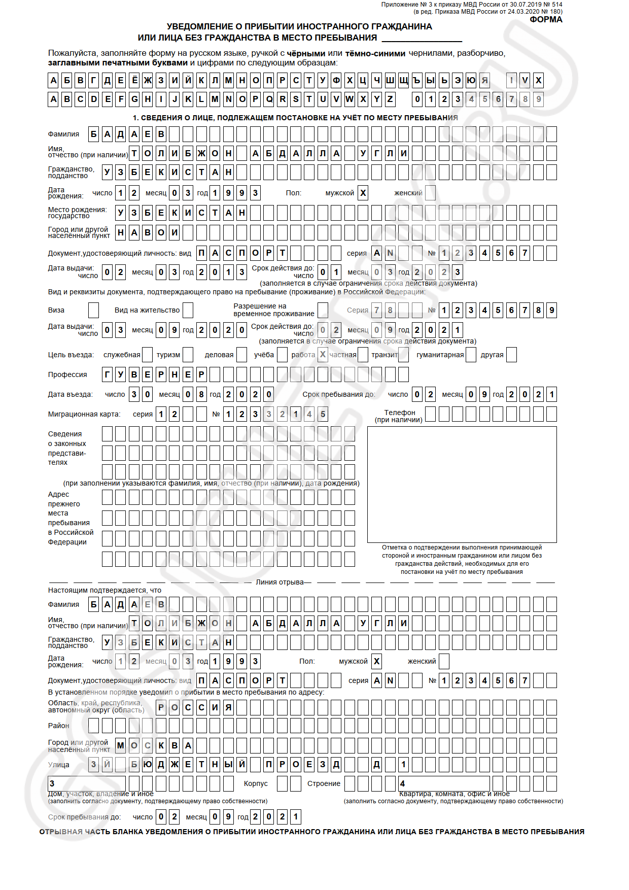 Пример. Заключен договор ГПХ с гражданином Узбекистана на сопровождение ребенка в качестве гувернера с проживанием по домашнему адресу нанимателя. Уведомление в этом случае примет такой вид: