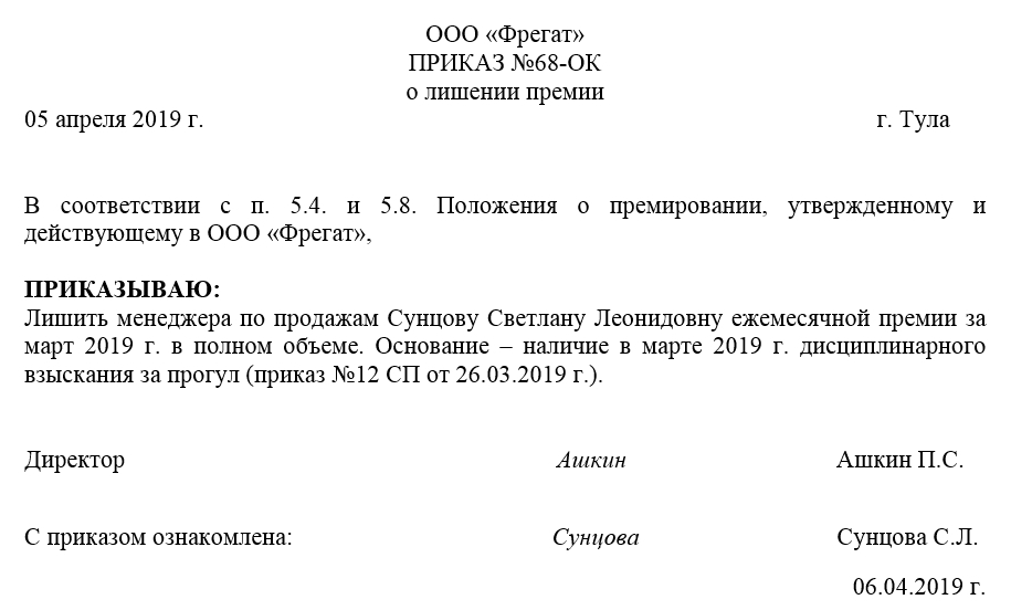 Образец приказа о лишении премии.