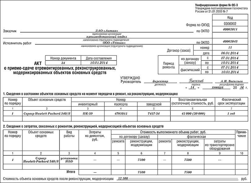 Скачать пример заполнения акта о приеме-сдаче ОС после ремонта (форма ОС-3)