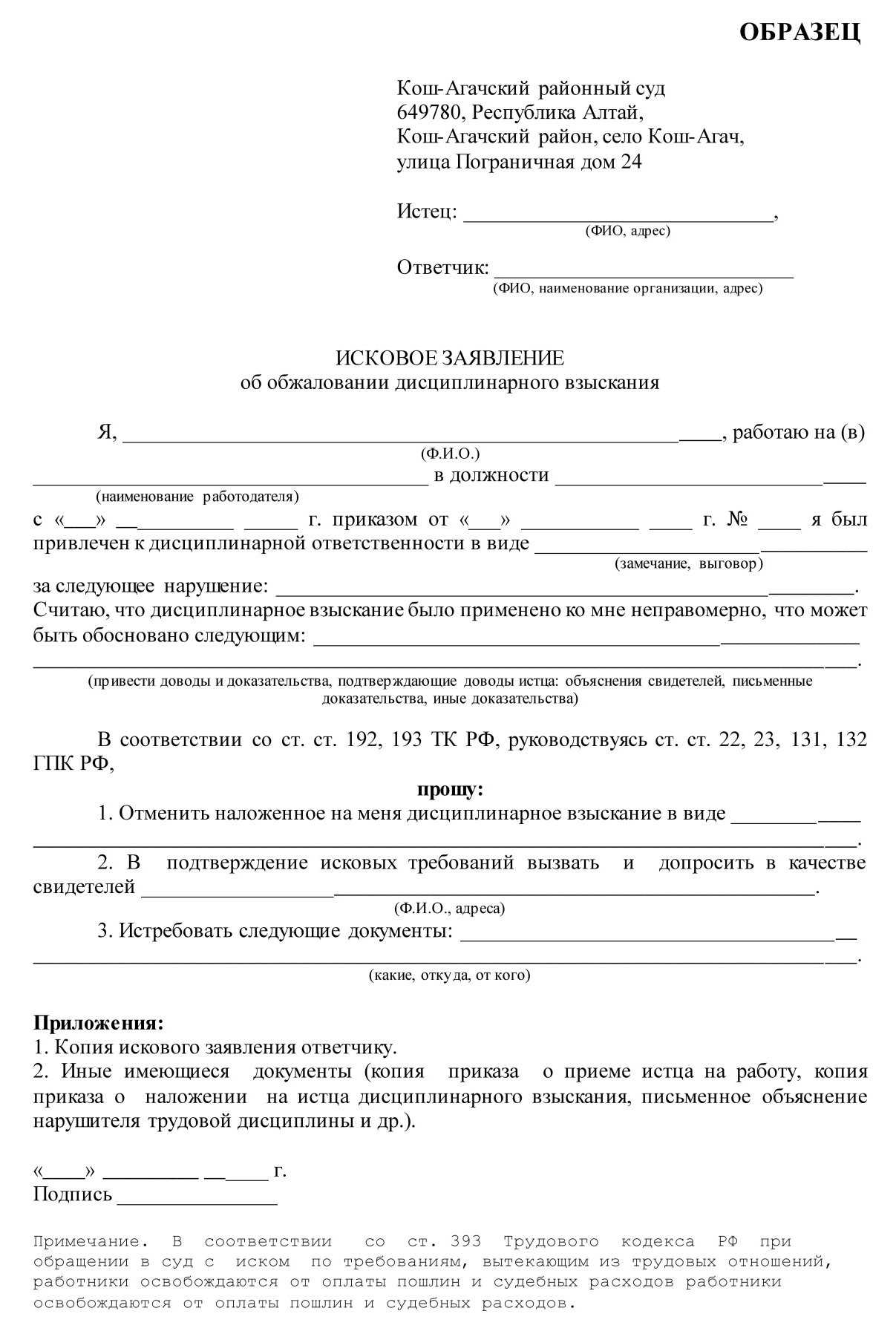 В суд необходимо подать исковое заявление в течение 3-х месяцев с момента нарушения прав. Если в результате дисциплинарного взыскания было произведено увольнение работника, то оформить иск нужно в течение 1 месяца.