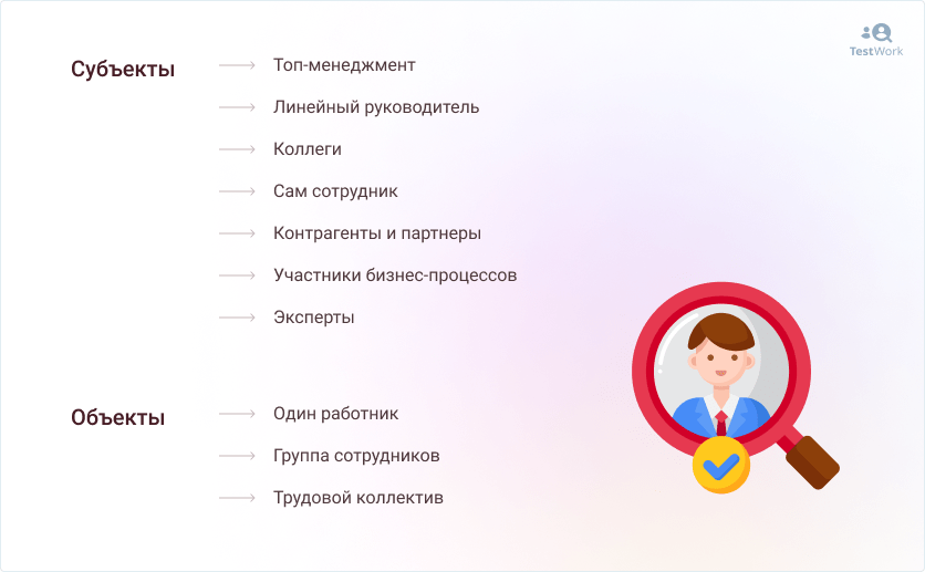 В процессе применения методов оценки сотрудников участвуют 2 стороны: кто анализирует (субъекты) и кого анализируют (объекты). Ни одним нормативным актом или документом не регламентируется состав оценивающих персонал лиц — это может быть один руководитель, группа сотрудников или независимая комиссия, состоящая из приглашенных экспертов. Объектами выступают профессиональнее и личные характеристики, поведение, результаты деятельности работников.