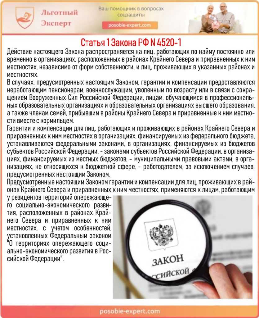 Еще одним документом, который регулирует назначение северных льгот, является Закон №4520–1, утвержденный Президентом РФ в 1993 году. Данный документ гарантирует государственные выплаты и соцподдержку лицам, которые проживают и работают в суровых метеоусловиях дальних районов страны.