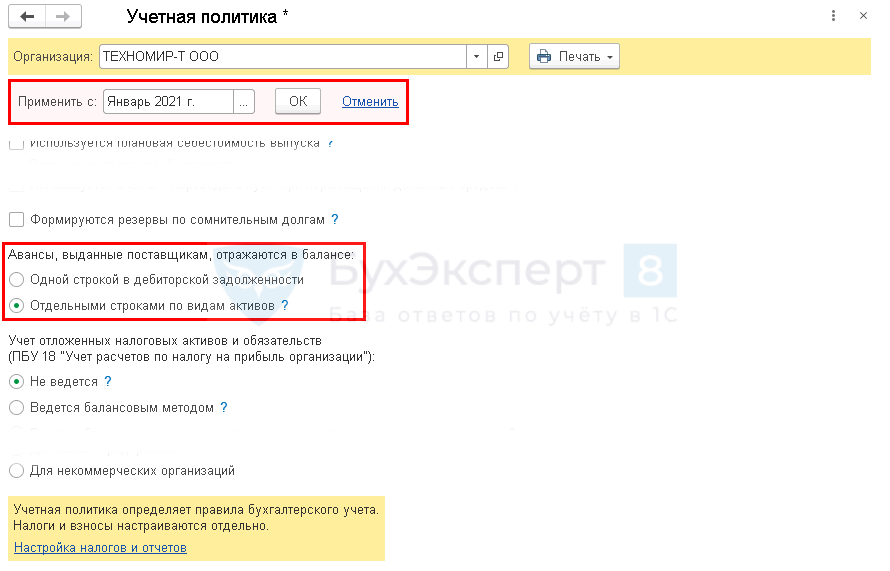 - Применять с — период, с которого применяется новый порядок отражения авансов (если нужно сформировать отчетность за 2020 год с учетом нового порядка, укажите Декабрь 2020 г.);