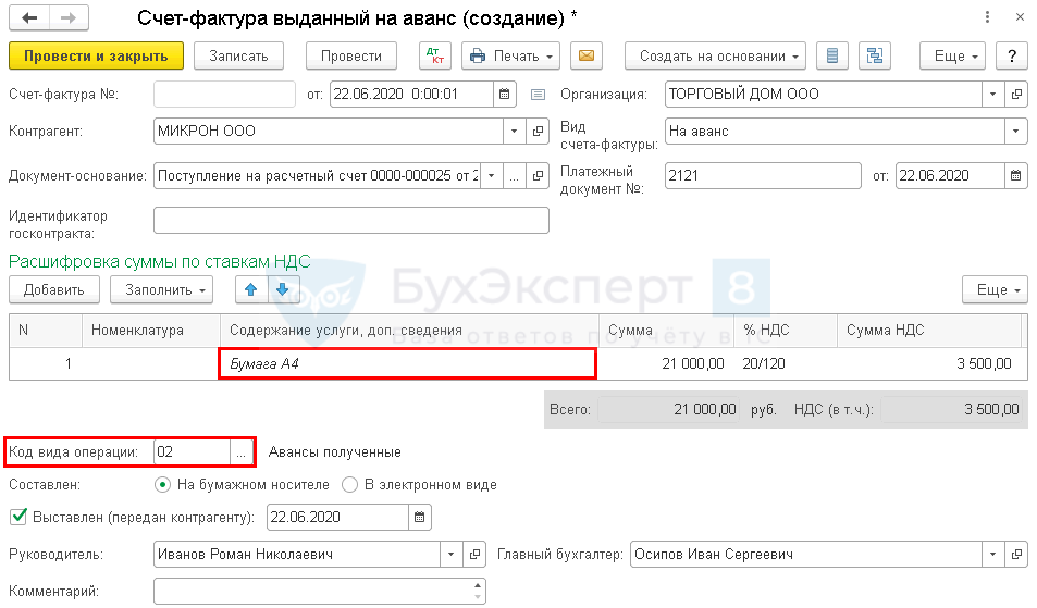 Создайте документ Счет-фактура выданный вид операции На аванс на основании Поступления на расчетный счет (раздел Банк и касса — Банковские выписки — кнопка Создать на основании — Счет-фактура выданный).