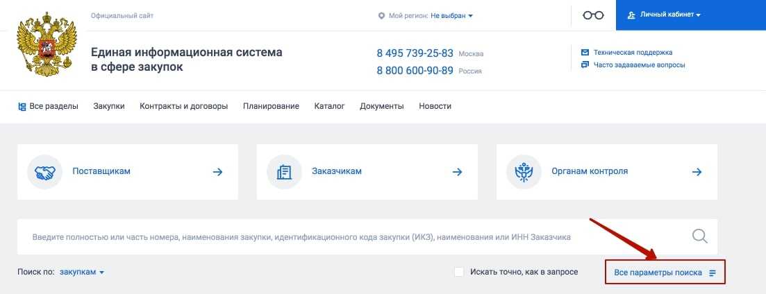 Для более точного поиска закупок рекомендуется использовать настройки расширенного поиска. Для этого на главной странице сайта ЕИС под строкой быстрого поиска вам нужно нажать по гиперссылке “Все параметры поиска”.