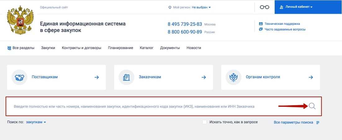 Строка быстрого поиска находится на главной странице сайта и подходит для поиска закупок по ключевым словам, номеру закупки, идентификационному номеру закупки (ИКЗ), наименованию или ИНН заказчика.