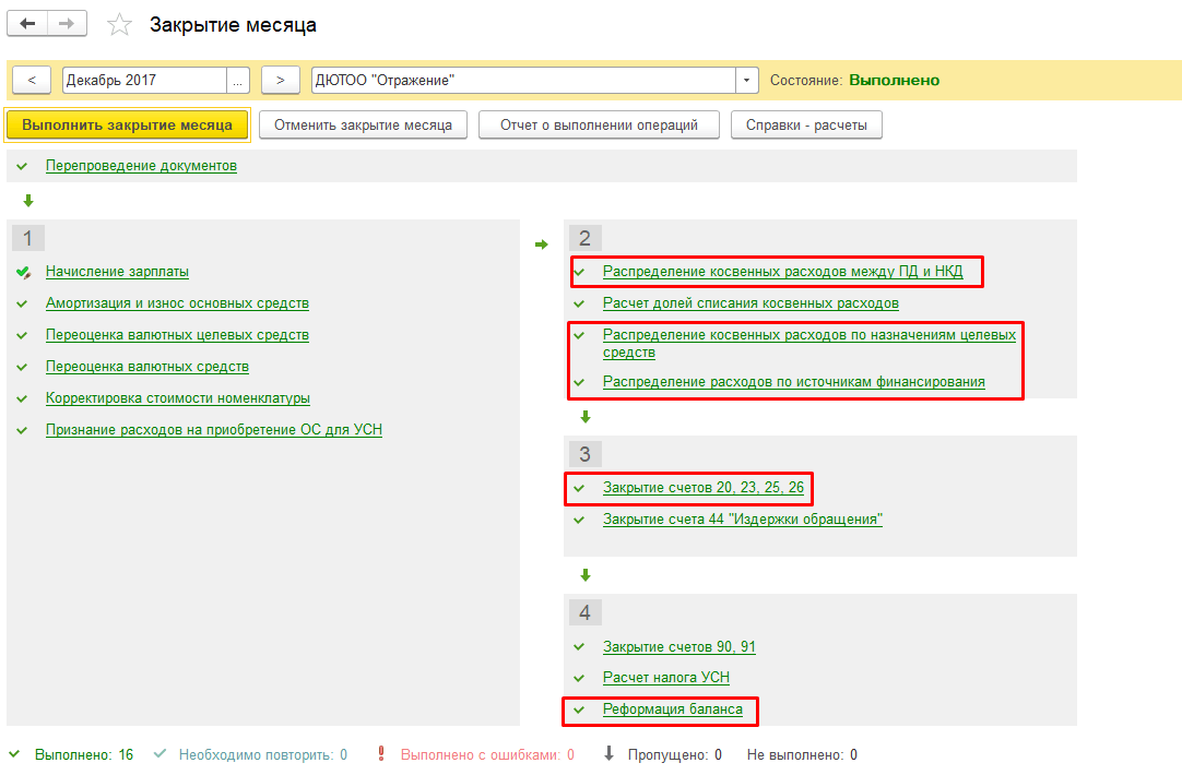 После выполнения всех операций по распределению для корректного закрытия месяца нужно проверить: