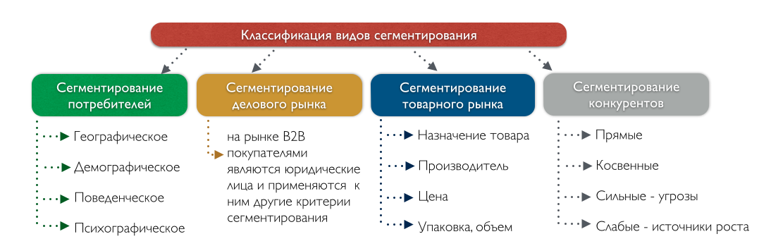 Маркетинг — наука универсальных методов. Методологию сегментации рынка можно использовать не только для разделения на однородные группы потребителей и поиска целевой аудитории. В своей ежедневной деятельности менеджер по маркетингу использует как минимум 4 вида сегментации: сегментирование покупателей, товарных групп, конкурентов и клиентов B2B сектора.