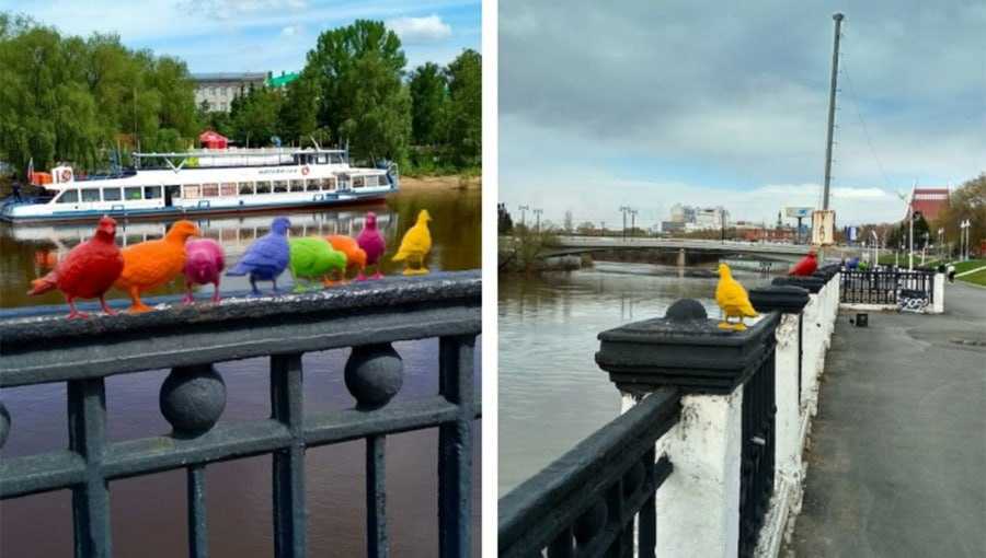 Другой случай такого «маразма» недавно произошёл в Омске, где отказались от скульптуры цветных голубей после критики мэра Сергея Шелеста. Градоначальник углядел в инсталляции признаки пропаганды ЛГБТ.