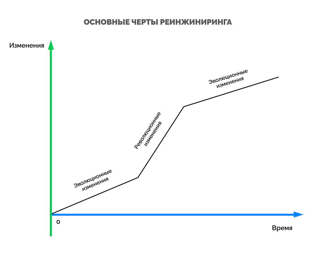 - Перепроектирование. Процессы анализируются и изменяются с учетом прогнозов относительно рынка и компании.
