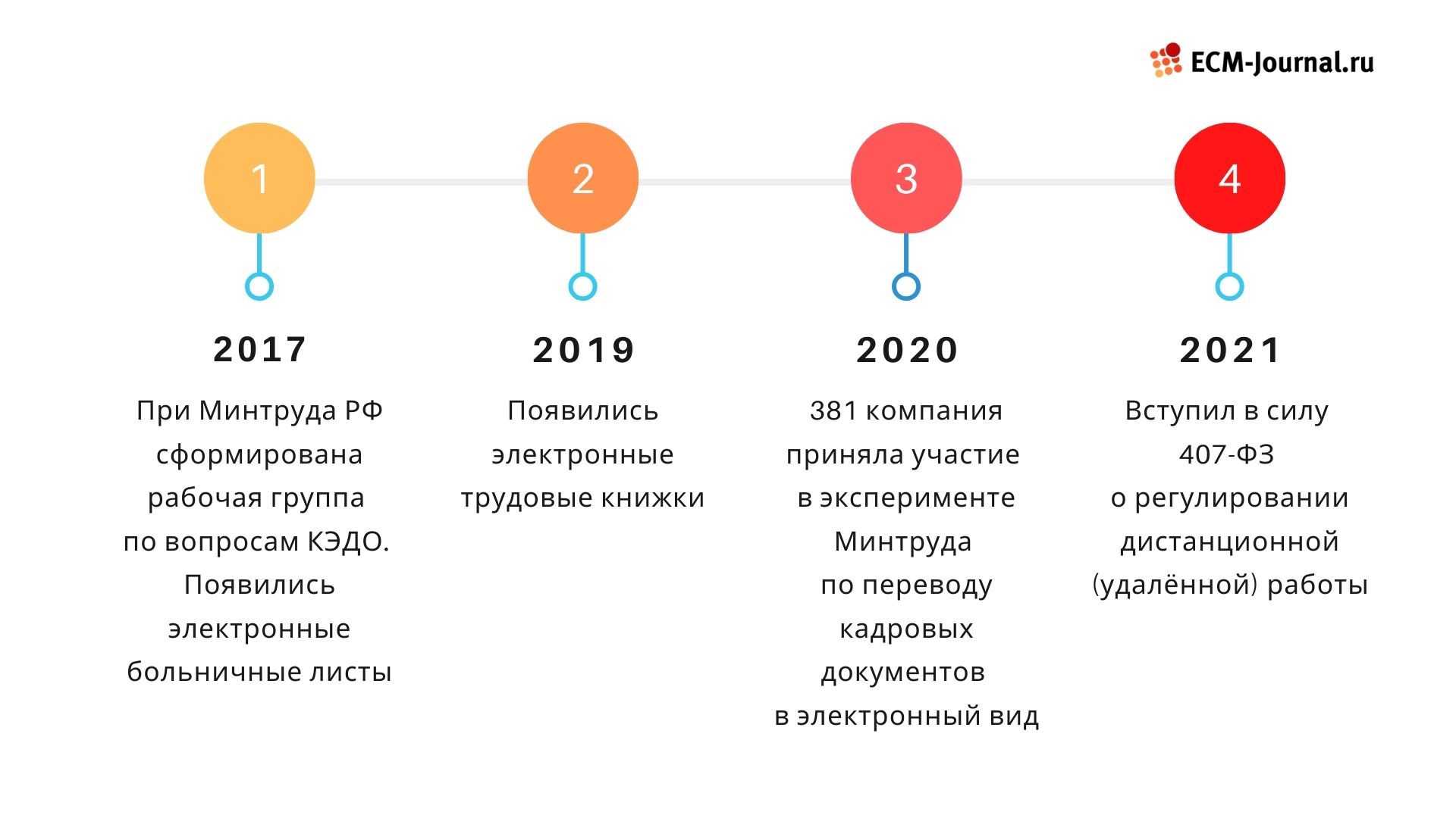 За 2018–2021 годы Министерство труда и соцзащиты РФ запустило сразу два эксперимента по электронному документообороту в HR. Особенно впечатляет второй, в рамках которого на КЭДО перешла 381 организация. Опыт и выводы компаний-пионеров повлияют на дальнейшие изменения законодательства.