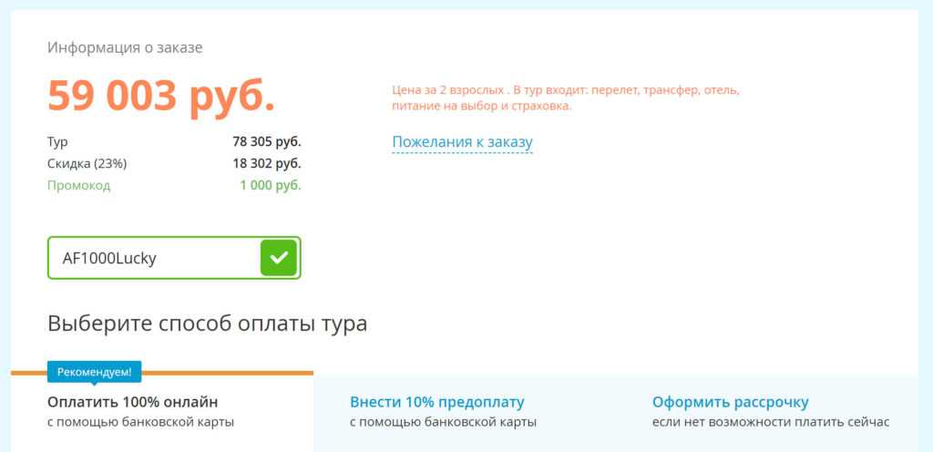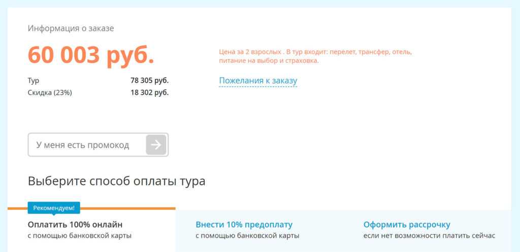 Оплатить полную стоимость выбранного тура нужно с одной карты одним платежом.