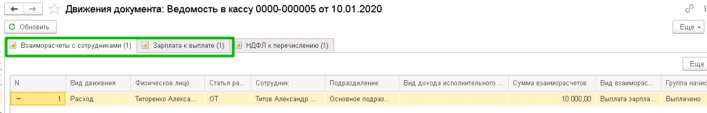 А в верхней половине экрана показать движения документов Ведомость и документа уплаты и с операцией Расход повторить аналитику. Сумму возврата указать отрицательную. Взаиморасчеты с сотрудниками
