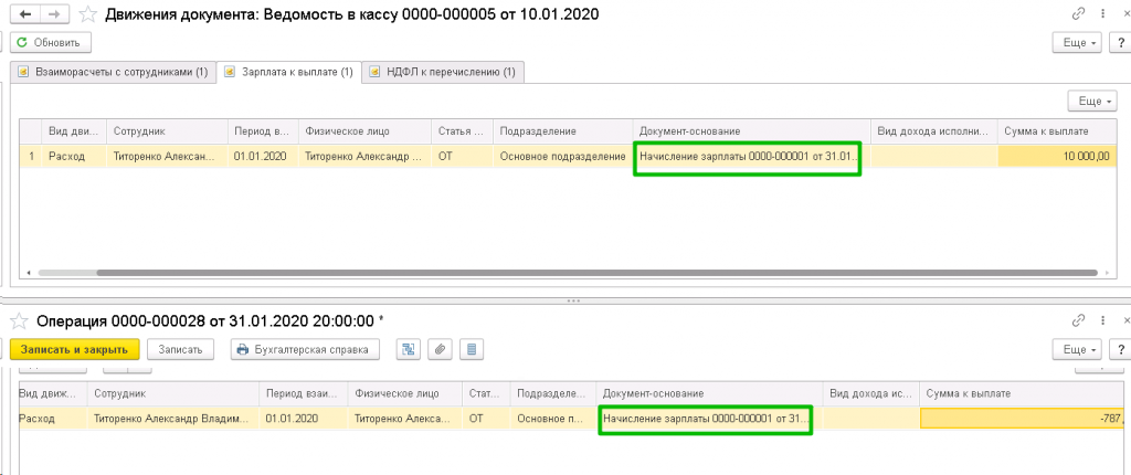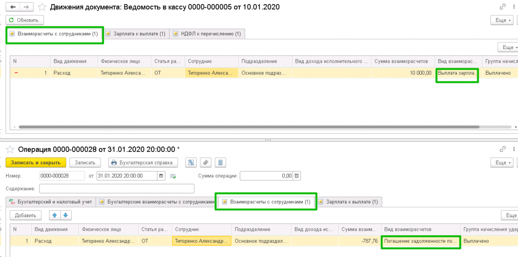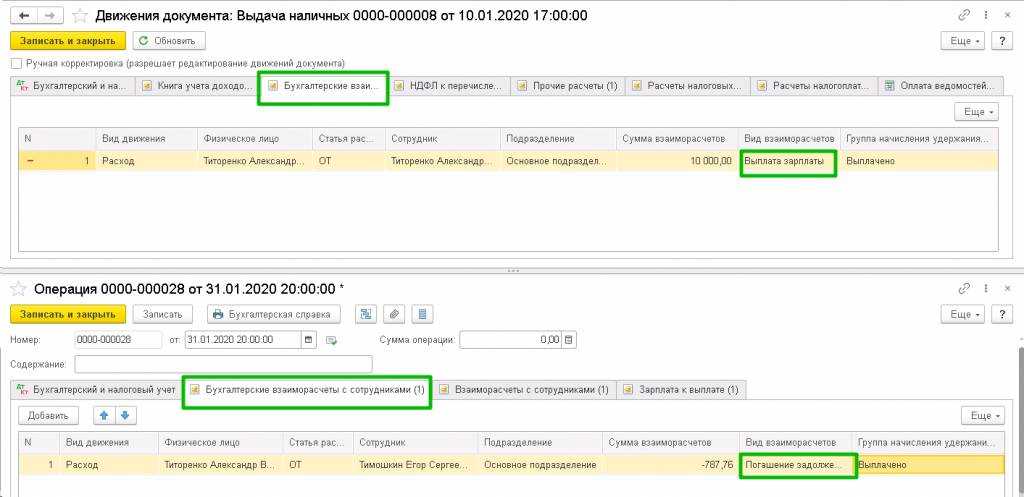 Это вызвано тем, что при отражении выплаты зарплаты посредством документа Списание с расчетного счета или Расходный кассовый ордер с документом-основанием Ведомость (в кассу, в банк или на счета) программа производит движение не только по счетам, а еще и по зарплатным регистрам. А возврат задолженности через ПКО с операцией Прочий приход произвел только движение по счетам. Какие именно регистры задействованы, можно посмотреть по кнопке ДтКт в Ведомости и по кнопке ДтКт в документе уплаты (РКО или Списание с расчетного счета): В Ведомости это Взаиморасчеты с сотрудниками (служит для отражения в Расчетном листке и т.п.) Зарплата к выплате (служит для заполнения Ведомостей).