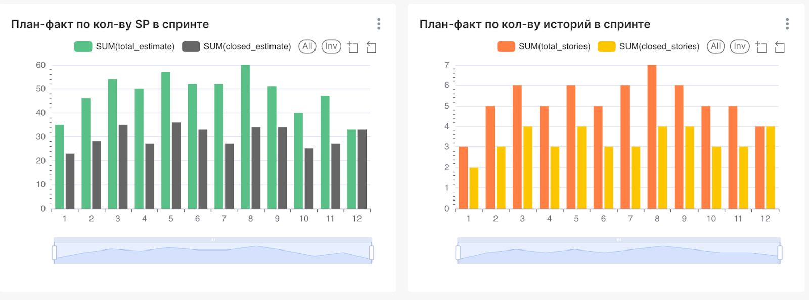 Количество выполненных Story Points (причем измеряется каждая отдельная задача для каждого сотрудника, а не общая продуктовая фича несущая ценность);