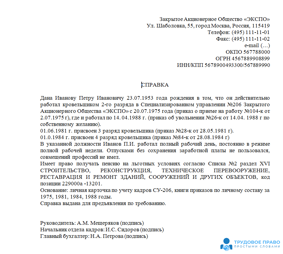 Вместе с тем в «Основных Правилах работы архивов организаций» от 06.02.2002 есть приложение 42 с примером справки. Но поскольку Правила носят методический и информативный характер, этим примером можно не пользоваться. Главное, что требуется от кадровика, — соблюсти основные требования к выдаваемому документу: