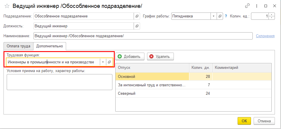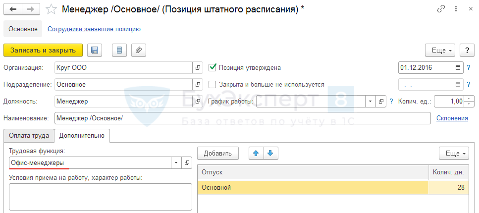 Если в программе ведется штатное расписание, то трудовая функция может быть указана для позиции.