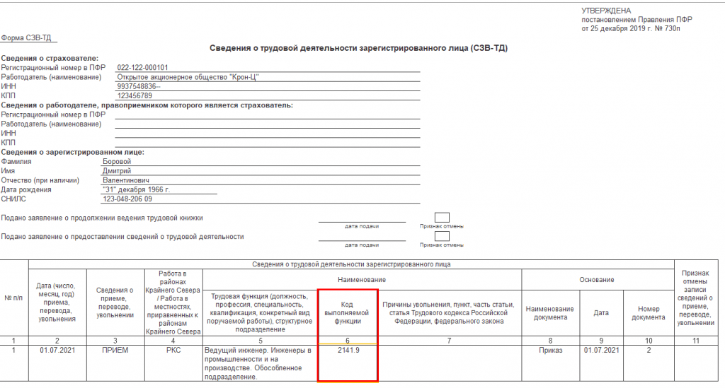 С 1 июля 2021 года это уже графа 6. В ней отражается кодовое обозначение занятия, соответствующее занимаемой должности (профессии), виду трудовой деятельности, осуществляемой на рабочем месте при исполнении трудовых функций (работ, обязанностей). Указывать код трудовой функции должны все работодатели, независимо от того, применяют они профстандарты или нет.