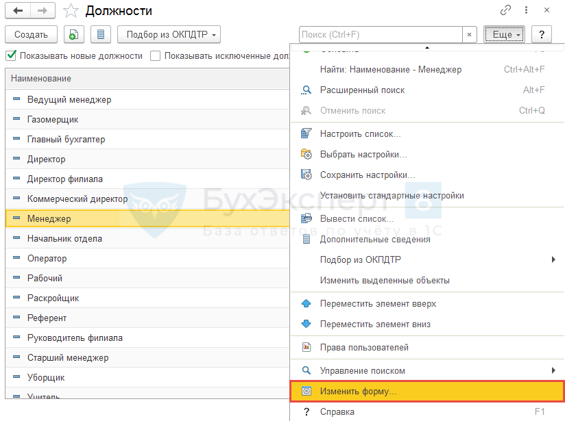 В этом случае в справочнике Должностей (Настройка – Должности) воспользуемся командой Еще – Изменить форму…
