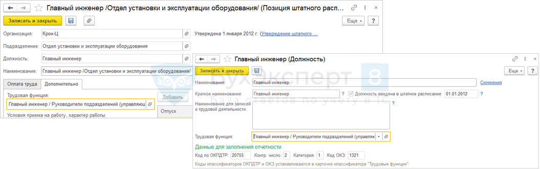 Если вы ранее заполняли в должностях коды с целью заполнения статистических отчетов, но трудовые функции не указывали, то после обновления необходимо (для заполнения этих отчетов в дальнейшем) в должностях указать трудовую функции с такими же кодами. Для облегчения этого процесса в карточку должности добавлена интерактивная подсказка.