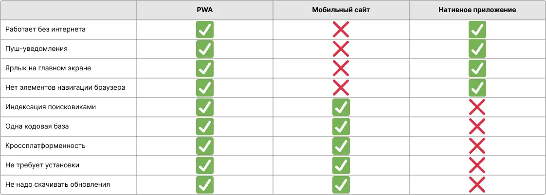 PWA (Progressive Web Application) — когда мобильная версия сайта устанавливается на смартфон как приложение. Из плюсов — не надо поддерживать две кодовые базы, под iOS и Android, приложение всегда «обновлено» до последней версии, можно работать с некоторыми нативными функциями смартфонов. Например, отправлять пуши, устанавливать ярлык на экран, элементы навигации браузера не мешают (их просто нет). такие приложения умеют создавать и Bubble, и Adalo, и Glide.