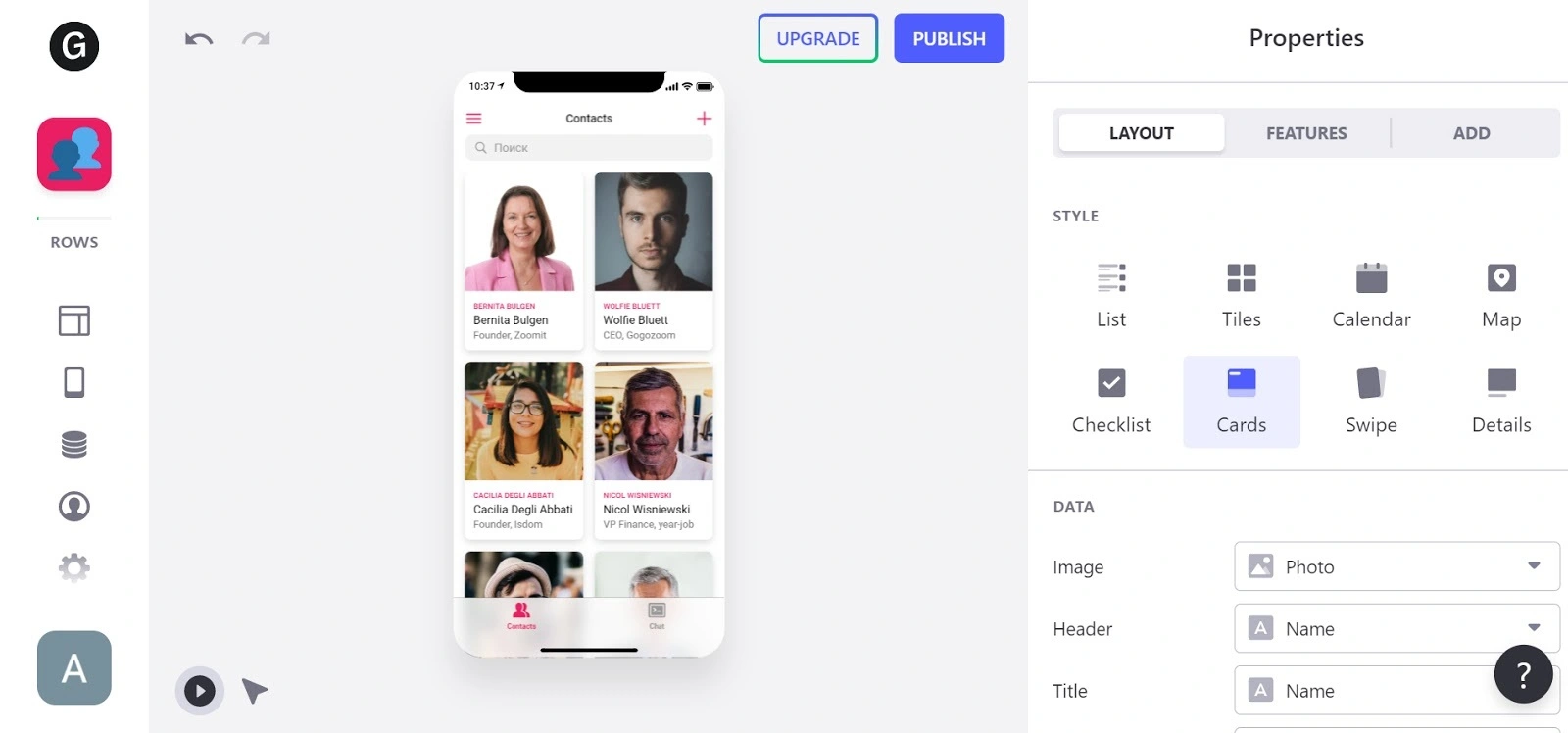 Нативные — когда приложение публикуется в официальных сторах. В Adalo уже встроена такая функция, а приложения на Bubble можно обернуть в специальный контейнер и тоже опубликовать в Google Play и App Store. Нативные приложения позволяют работать со всеми функциями телефона: камерой, микрофоном, GPS, контактами, файлами, акселерометром, push-уведомлениями, памятью девайса, адаптивной версткой — всё, как в обычном коде, только без кода.