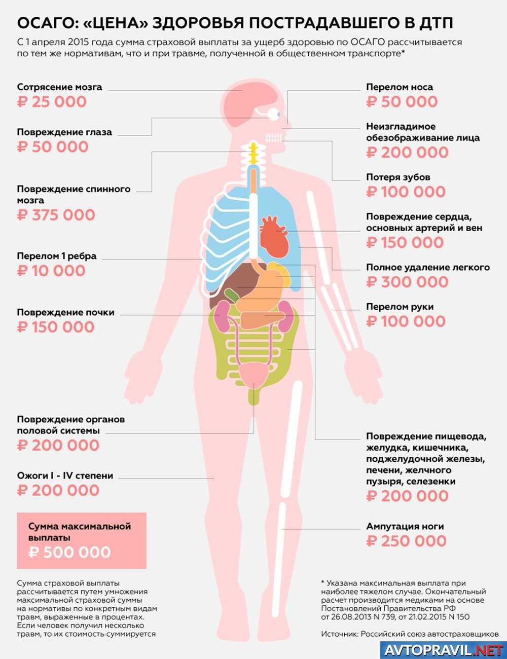 В зависимости от увечий, полученных в результате аварии, потерпевший может получить компенсационные выплаты за счет ОСАГО. Максимальный размер компенсации вреда здоровью после ДТП по ОСАГО составляет 500 000 рублей. Общая сумма состоит из нескольких составляющих по каждому виду повреждения , некоторые из них приведены на рисунке: