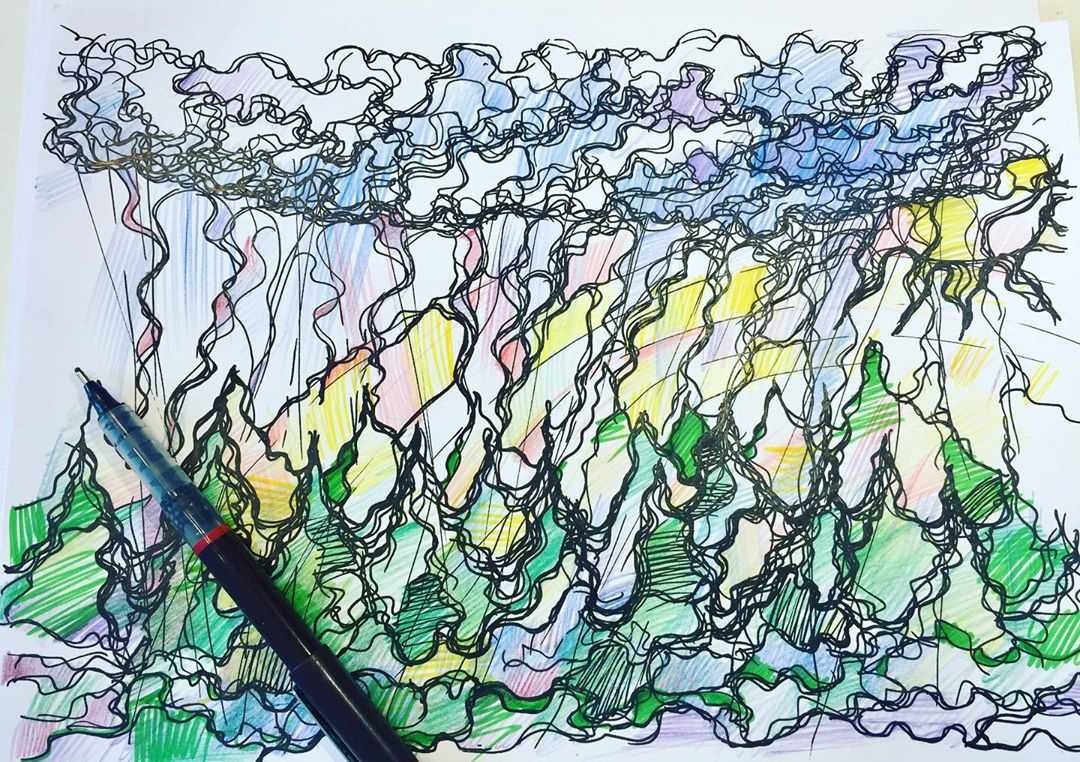 Нейрографический рисунок, выполненный в технике «Шаманский дождь».