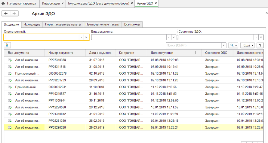 После сопоставления у пользователя есть выбор: создавать документ учета на основе полученного ЭД (электронного документа) или нет. Все полученные, отправленные, сформированные пакеты электронных документов хранятся в «Архиве ЭДО», в архив можно попасть, нажав по одноименной ссылке, находящейся внизу формы «Текущих дел ЭДО». Здесь можно обратиться к любому документу, распечатать его при необходимости вместе с карточкой документа, в которой отражается информация об электронных подписях. Вся документация, которая участвует в составлении отчетности, автоматически создается в базе и хранится в ней же, что дает гарантию того, что отчеты будут сформированы правильно, и при проверке все необходимые документы будут быстро предоставлены в контролирующие органы.