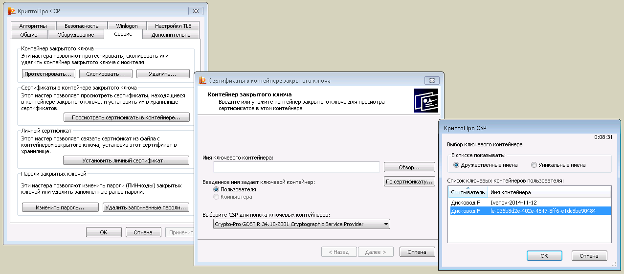 Дальше все просто. Запускаем КриптоПро CSP. Закладка Сервис, кнопка Посмотреть сертификаты в контейнере, нажимаем Обзор для выбора токена с криптохранилищем, и выбираем нужно нам хранилице. Обычно на одном токене одно хранилище.