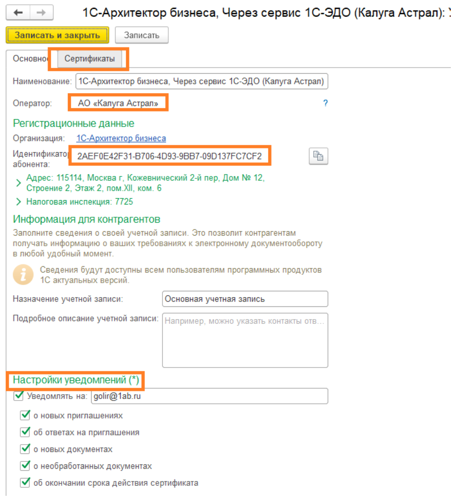 - После подключения можно копировать и сообщать контрагентам оператора и идентификатор ЭДО, а также изменить назначение, настроить уведомления.