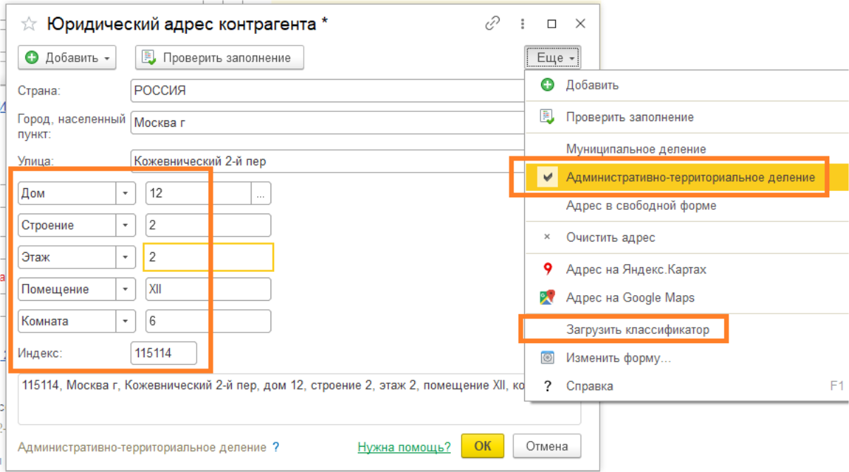 Если помощник выдал ошибку, связанную с заполнением юридического адреса, следует изменить способ его заполнения на «административно-территориальное деление» как показано на картинке ниже. Если потребуется, стоит загрузить классификатор;