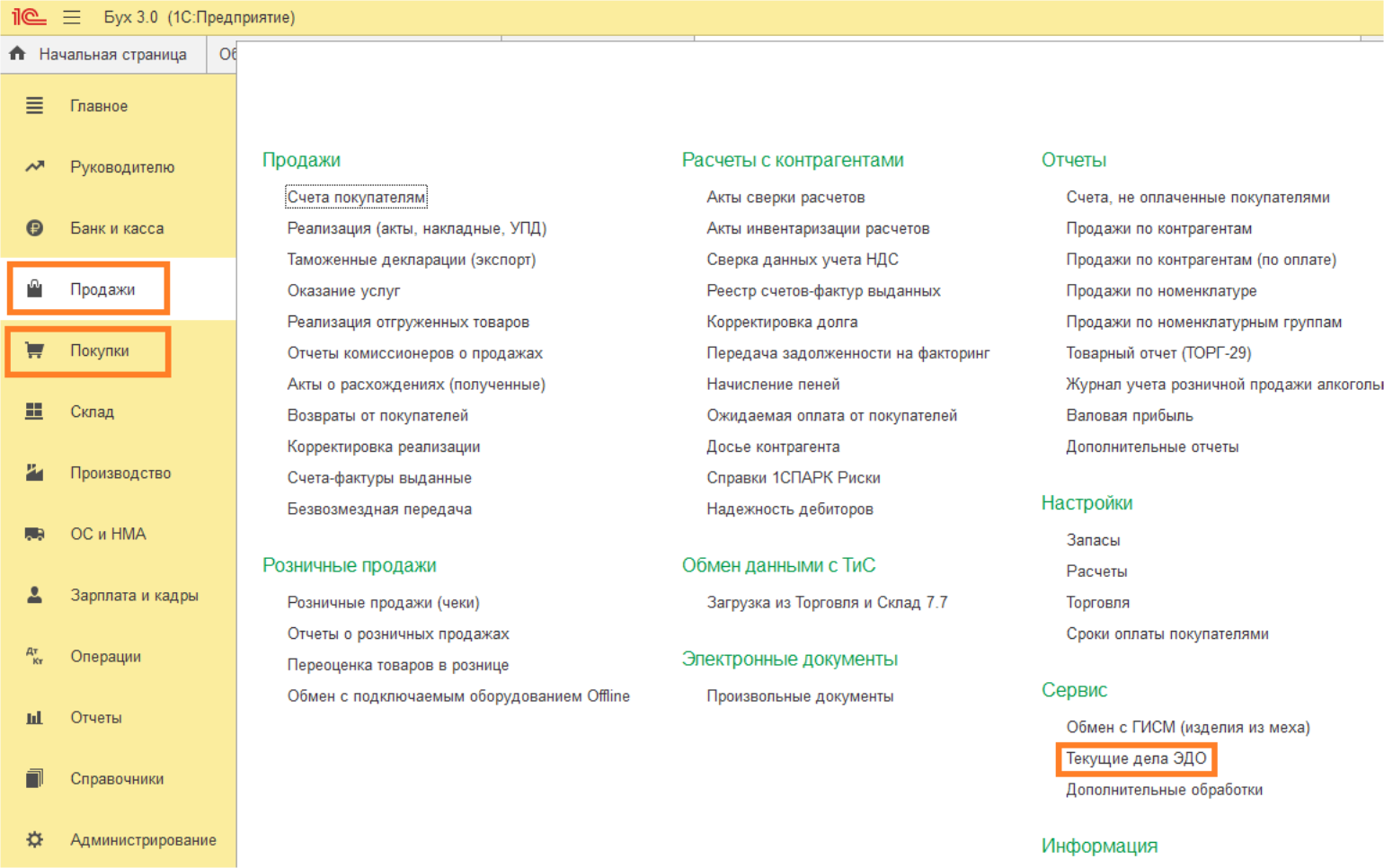 Для работы с электронными документами и приглашениями предназначена обработка «Текущие дела ЭДО». Зайти в неё можно из разделов «Продажи» и «Покупки».