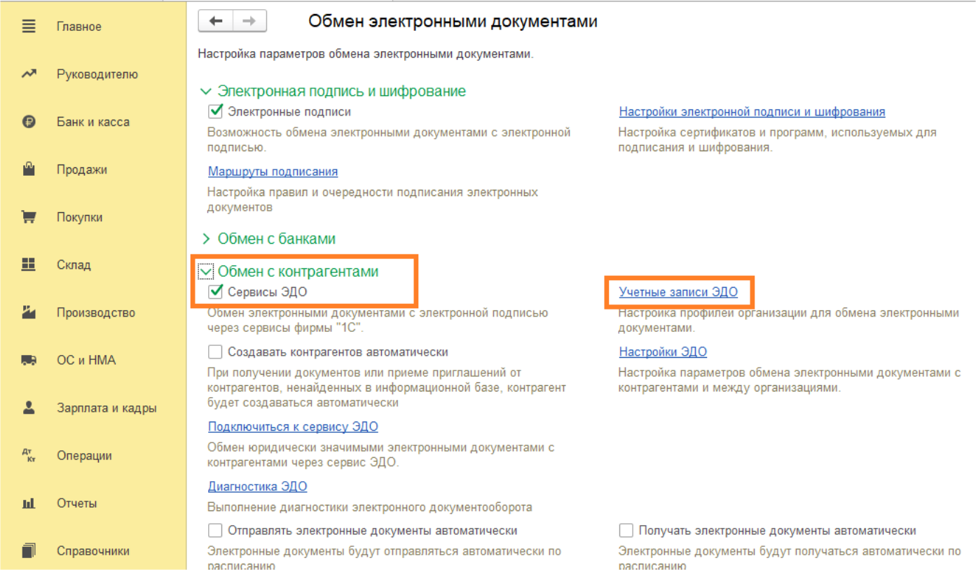 Возвращаемся к подразделу «Обмен электронными документами» в программе «1С:Бухгалтерия».