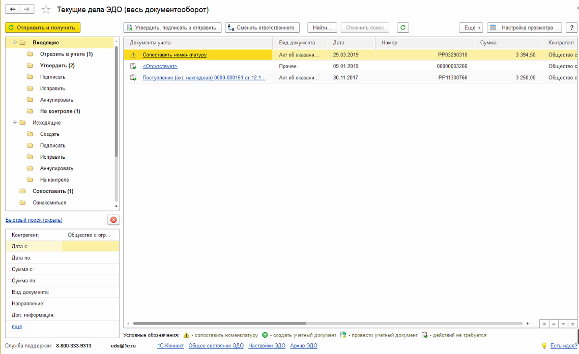 После ввода пароля в «Текущих делах ЭДО» в папке «Входящие» отобразятся пришедшие от контрагентов документы. Если это первый цикл обмена, то в полученном документе необходимо единично сопоставить номенклатуру продавца и покупателя.