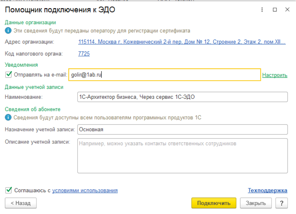 Рис. 9. Помощник подключения к сервису 1С-ЭДО