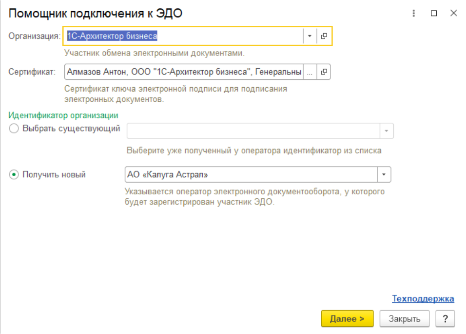 Откроется помощник подключения к сервису 1С-ЭДО.