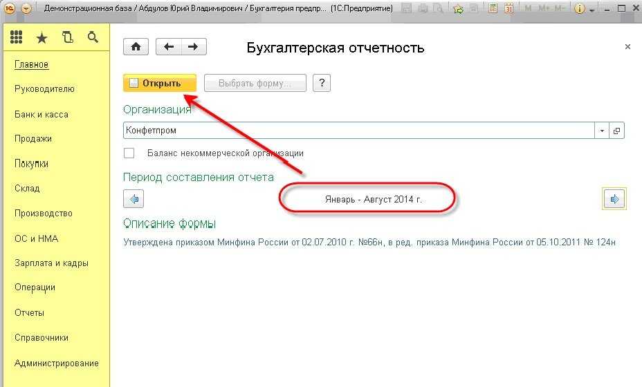В стартовой форме бухгалтерской отчетности нужно выбрать период, за который нам нужен ликвидационный баланс. Например, январь – август 2014 года. Далее нажимаем на кнопку Oткрыть (рис. 3).