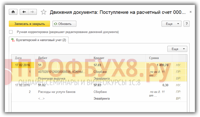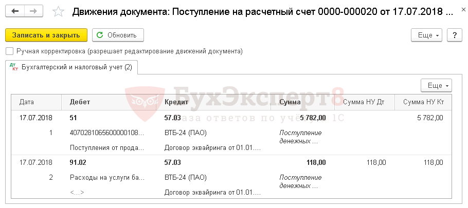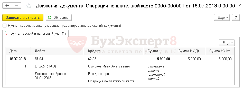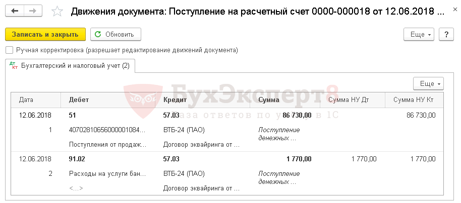 После чего в 1С 8.3 закрывается задолженность банка – эквайера и формируется проводка по услугам банка по эквайрингу. Движение по документу будет следующим: