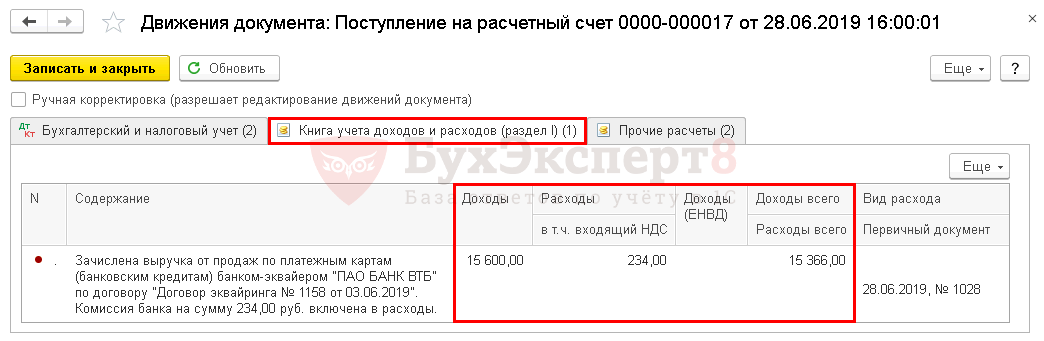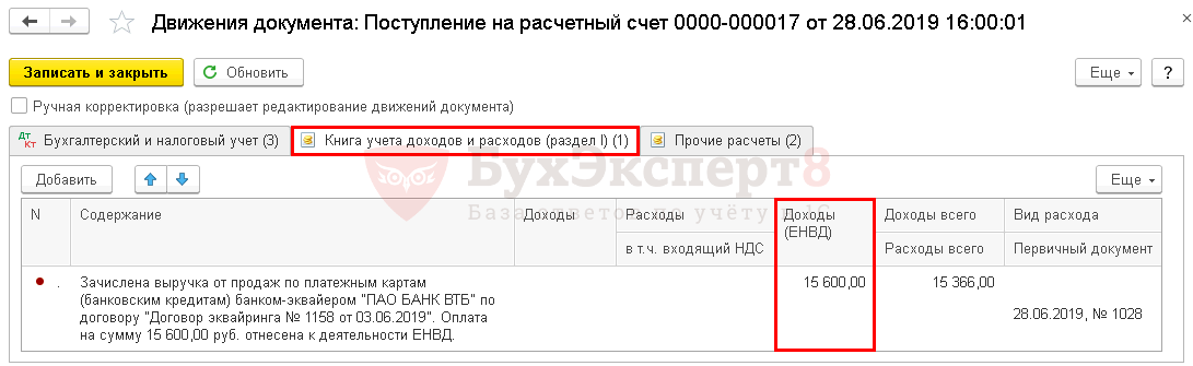 Тем самым, при поступлении оплаты программа доходы отразит по ЕНВД. Рассмотрим проводки документа Поступление на расчетный счет вид операции Поступления от продаж по платежным картам и банковским кредитам.