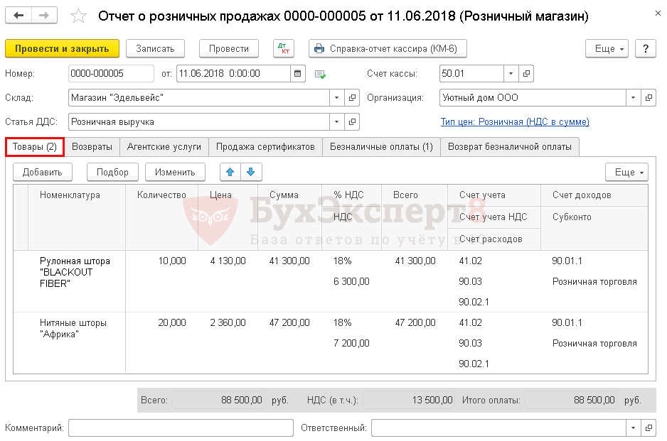 Сразу оговорюсь, что реализация у нас может быть в розницу и оптом. Как правило, реализация в розничном магазине фиксируется в учетной системе автоматически при закрытии торговой смены (можно выгрузить информацию и в любое другое время). Вместе с выгрузкой информации о проданных товарах (в программе создается документ «Отчет о розничных продажах«) должна выгружаться и информация об оплате. Тут же и должно произойти разделение на оплату наличными и оплату безналичными денежными средствами.