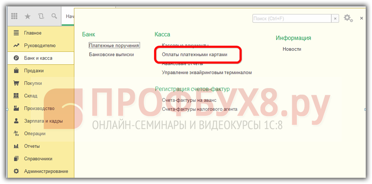 Оплата платежной картой в 1С 8.3 Бухгалтерия.