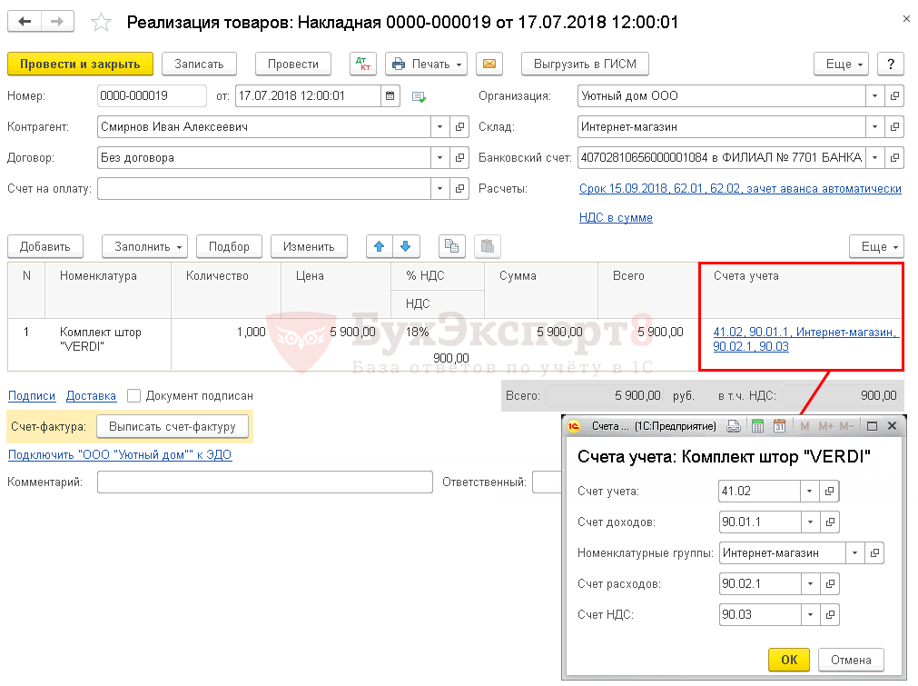 Если розничный магазин находится на ЕНВД, то при реализации выберите соответствующий счет доходов 90.01.2.