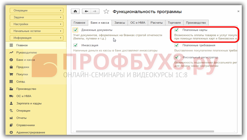 Перейдем на закладку Банк и касса. Отметим флажком Платежные карты. Эта настройка дает возможность проводить в 1С 8.3 расчеты по товарам с использованием банковских (платежных) карт: