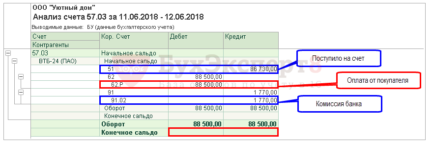 Отсутствие конечного сальдо по счету 57.03 показывает, что оплата покупателя поступила в полном размере за вычетом сумм вознаграждения банка. Задолженности за банком нет.