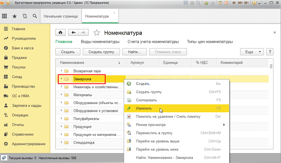 ) и выбираем тот элемент, номенклатурную группу которого хотим изменить. Щелкаем по нему левой кнопкой мыши два раза или вызываем контекстное меню, щелкнув по элементу правой кнопкой, выбираем пункт Изменить