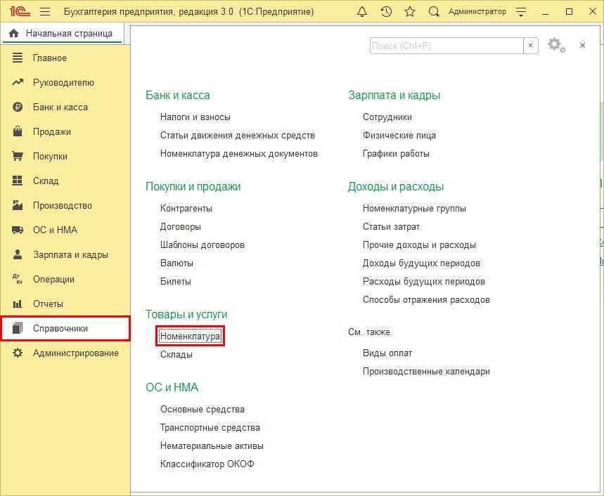 Заходим в раздел «Справочники» пункт «Номенклатура»: