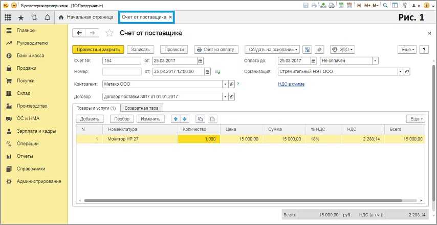 Отражение счета на оплату в 1С Бухгалтерия