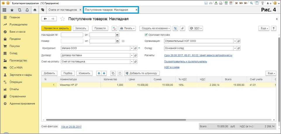Если организация является плательщиком НДС, после отражения операций по оплате счета и оприходования товара, необходимо создать и провести в информационной системе 1С Бухгалтерия 8.3 полученный счет-фактуру.