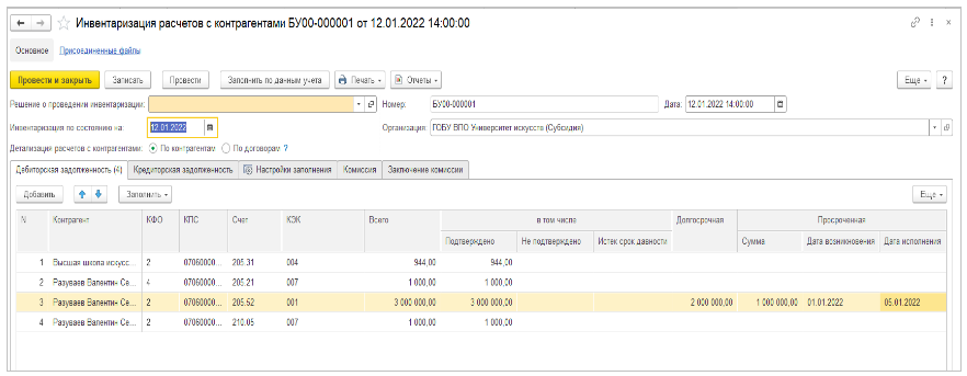Напоминаем, что для учета долгосрочной и просроченной задолженностей специальные счета не предусмотрены ЕПСБУ. В конфигурации «1С:Бухгалтерия государственного предприятия 8», ред. 2.0, документ «Инвентаризация расчетов с контрагентами» (Раздел «Учет и отчетность» – ссылка «Инвентаризация» – Документ «Инвентаризация расчетов с контрагентами») служит для определения и закрепления данных по кредиторской и дебиторской задолженности.